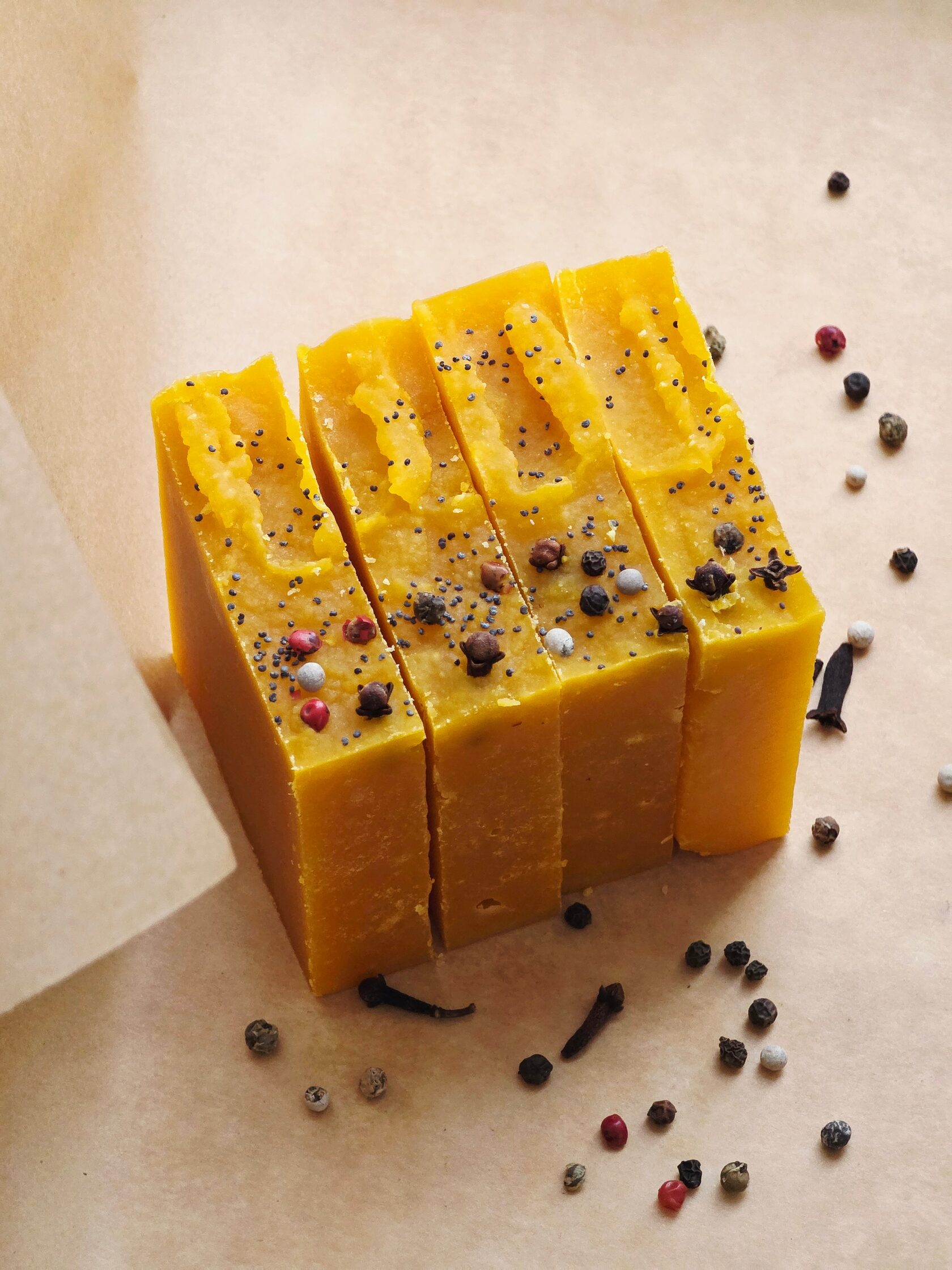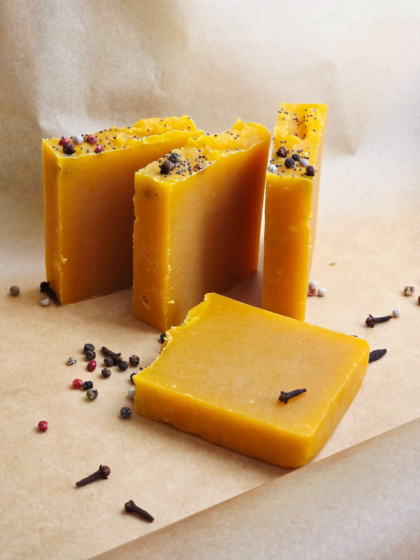 Мыло изготовлено полностью вручную из исключительно природных компонентов, путем смешивания масел и щелочи. Такой способ производства называется "Мыло с нуля".